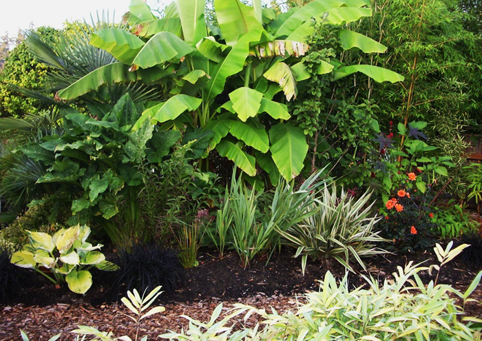 Hardy Chinese fan palm (Trachycarpus fortunei), giant timber bamboo (vivax), and perennials. |