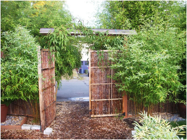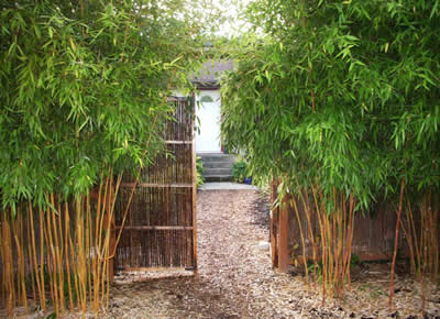 Bamboo and cedar gate and fence, Phyllostachys aurea ‘Koi’ both sides of gate, Phyllostachys aureosulcata ‘Spectablis’ above and behind fence, Clematis armandii above gate, and Pleioblastus viridistriatus in foreground. |