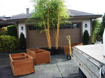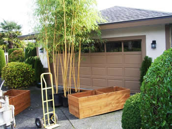 | The delivery of the planters, soil, and bamboo in large 25 gallon pots. The planters are built off-site, delivered and leveled, filled with an improved soil blend and planted. Installation was completed in one day. | |