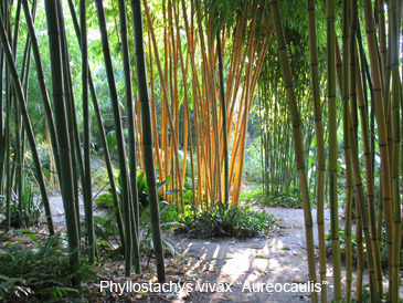 Phyllostachys vivax ‘Aureocaulis’, yellow culms with random green stripes, is much more vigorous than ‘Castillon’ and can grow to 50 feet or more. A very good choice for fast, high screens in larger landscapes. |