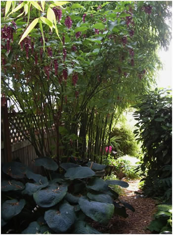 A narrow garden path with a big blue quilted hosta in the foreground and giant timber bamboo (vivax) behind. The vivax screens out neighbors’s second story windows but has a small footprint of only 2 x 6 feet. It can grow to 30 feet in 4 years, and eventually 50 feet or more. |